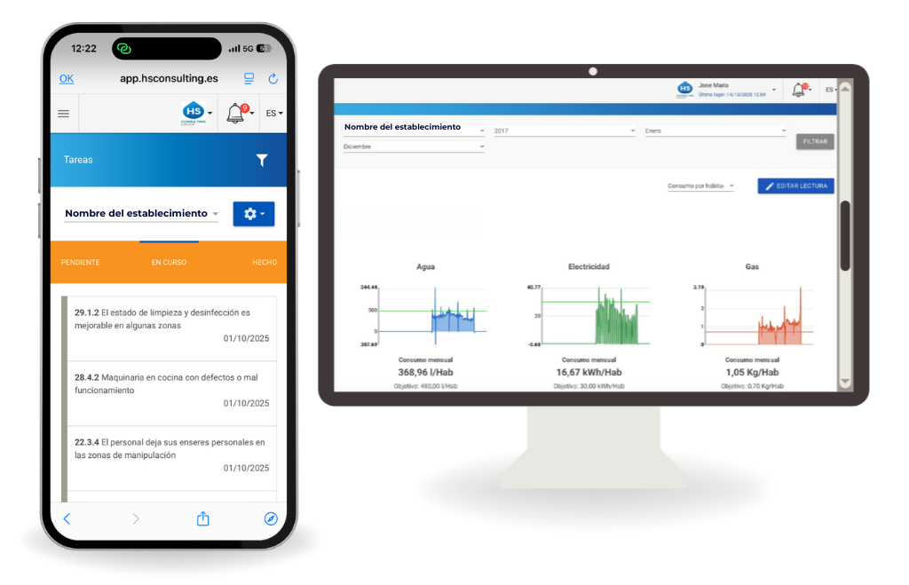 HS APP es la herramienta de gestión de riesgos a través de la que el establecimiento podrá tener controlado en todo momento y desde cualquier lugar del mundo, el estado higiénico sanitario del establecimiento.